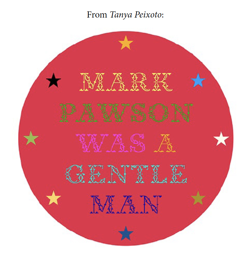 “In September 1999, Mark Pawson had two hundred file boxes produced. He signed the inside lid. The box in front of me is No.36/200. The outside of the box, both top and bottom, was printed in brown ink with small explosions announcing NO NEW WORK, as well as a facsimile of his signature, in a long diagonal, along with a linear list of things that he made: BADGES, BOOKS, COLLAGES, ENAMEL PLAQUES, MAILART, POSTCARDS, PRINTS, RUBBERSTAMPS, STICKERS, T-SHIRTS & ASSORTED EPHEMERA……